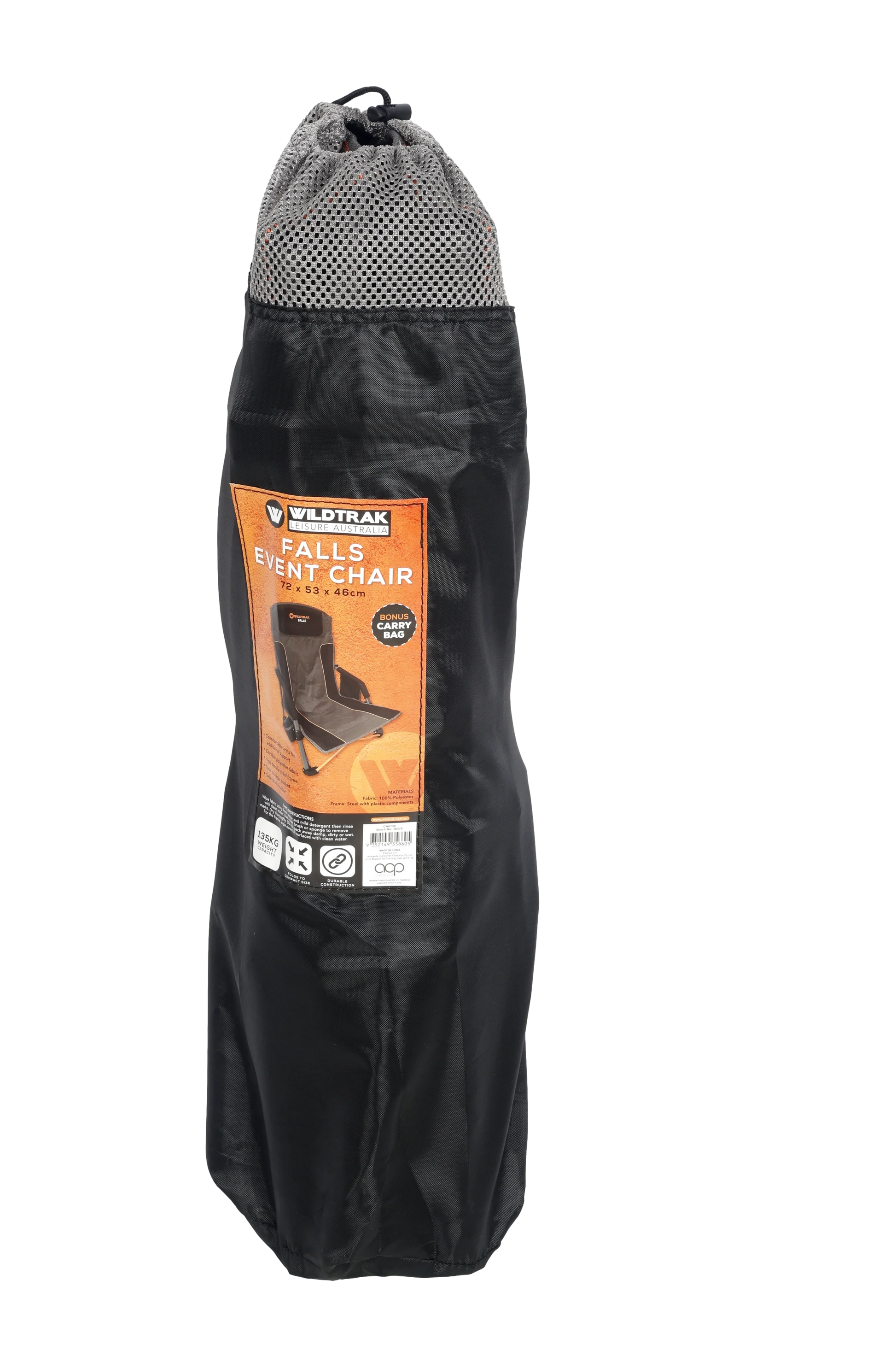 Falls Event Camp Chair, Foldable, Slight Recline, Cushioned, High Back, Drink Holder, Media Storage Pocket, Padded Arms, Low Rise, Weight Rated 135kg, Carry Bag with Shoulder Strap
